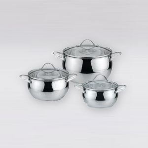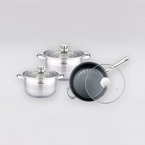 Набор посуды 6 предметов 9-шаговое Капсульное дно.Внутреннее антипригарное покрытие. Стальные ручки Стеклянная крышка. Размеры: 18х10,0см — 2,5л; 20х11,5см — 3,6л;24х6,5см-2,9л;.Подходит для индукции. -