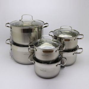 Набор посуды 12 предметов. Стеклянные крышки с паротводом. Состав: Кастрюля с крышкой Ø16х10.5см – 2.1л; Ø18х11.5см – 2.9л; Ø18х11.5см – 2.9л; Ø20х12.5см – 3.9л; Ø20х12.5см – 3.9л; Ø24х14.5см – 6.5л Капсулированное дно.Подходит для всех видов плит(включая индукционную) и для духового шкафа.Внутренняя и внешняя зеркальная полировка. -