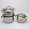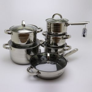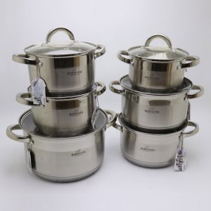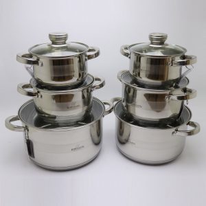 Набор кухонной посуды изготовлен из высококачественной нержавеющей стали с семислойным усиленным дном. Кастрюли снабжены крышками из термостойкого стекла с паровыпуском , а также удобными стальными ручками..Подходит для всех видов плит(включая индукционную) и для духового шкафа.Мерная шкала, которая быстро помогает хозяйке определить объем содержимого кастрюли.