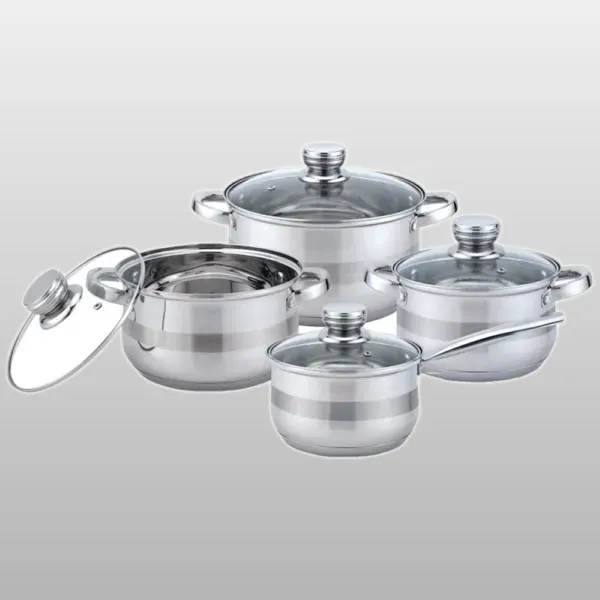 Набор кухонной посуды изготовлен из высококачественной нержавеющей стали с 7-ми шаговым капсульным дном. Изделия снабжены крышками из термостойкого стекла с паровыпуском , а также удобными стальными ручками.Подходит для всех видов плит(включая индукционную) и для духового шкафа.Мерная шкала, которая быстро помогает хозяйке определить литраж содержимого кастрюли.