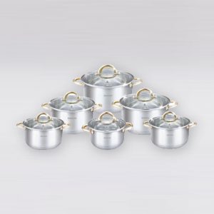 Набор посуды 12 предметов Стеклянная крышка. Стальные ручки. Кастрюля: 16х10,5см -2.1л; 18х11,5см-2.6л; 18х11,5см-2.6л; 20х12,5см-3,6л; 24х14,5см-6,3л; 26х14,5см-7,7л. дно 5-ти шаговое -