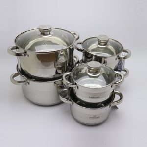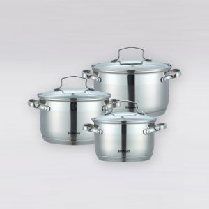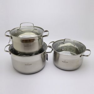 Набор кухонной посуды изготовлен из высококачественной нержавеющей стали с 7-ми шаговым капсульным дном. Изделия снабжены крышками из термостойкого стекла с паровыпуском , а также удобными стальными ручками.Подходит для всех видов плит(включая индукционную) и для духового шкафа.Мерная шкала, которая быстро помогает хозяйке определить литраж содержимого кастрюли.